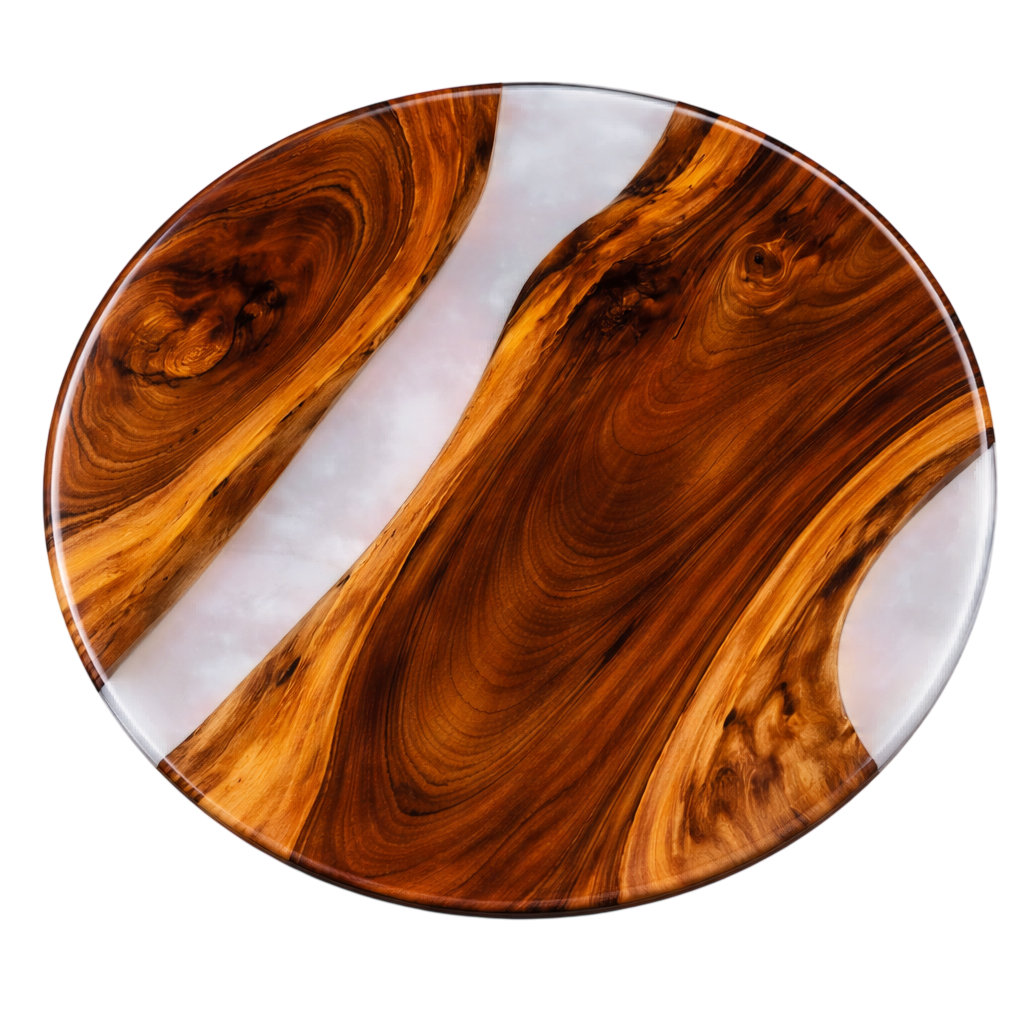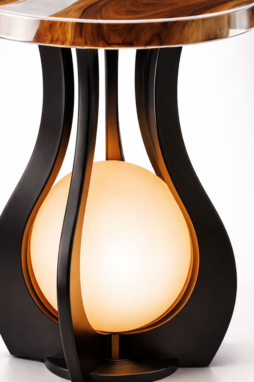 Fusion unique de bois naturel, résine époxy turquoise et structure sculpturale, avec une lumière intégrée qui crée une atmosphère chaleureuse et élégante.